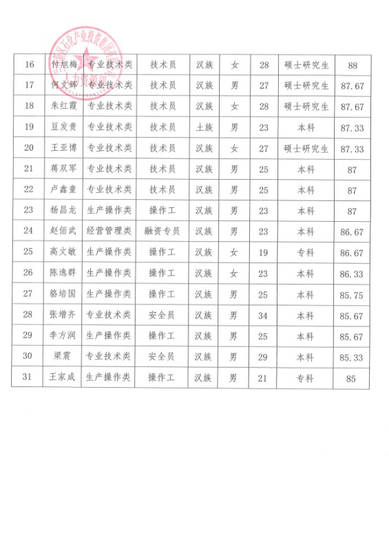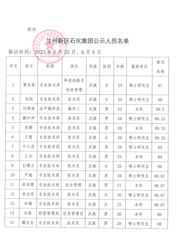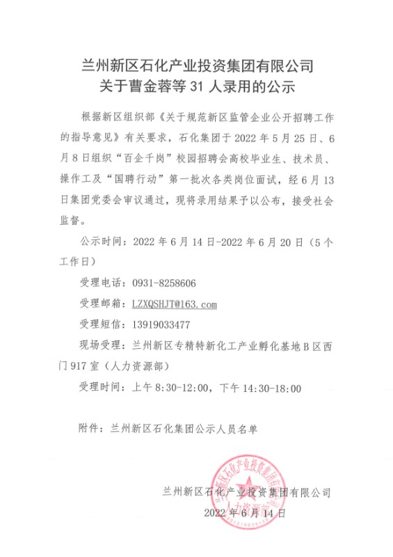 蘭州新區石化產業投資集團有限公司關于曹金蓉等31人錄用的公示