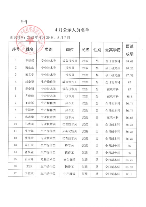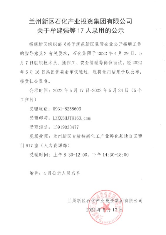 蘭州新區石化產業投資集團有限公司關于牟建強等17人錄用的公示