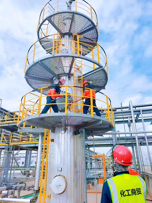 “高處作業的防范措施有哪些?堿液卸車前準備要做到哪些?監護人員的責任是否熟知……”10月4日,在化工園區物流園貨場各個施工現場,石化集團化工商貿公司值班領導及技術人員來到施工現場,進行例行巡檢。